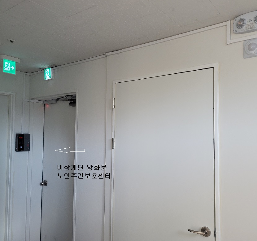 노인 주야간보호센터 계단 비상문에 화재연동 전자개폐기를 설치하여